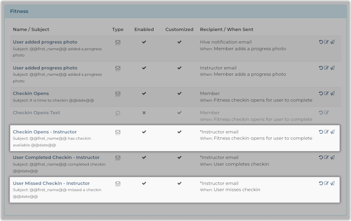 We've added 2 new automations that, if enabled, will send an email notification to instructors when a Client Checkin has opened or missed. These can be accessed from your admin dashboard by going to Communicate >> Automate Emails >> scroll down to the Fitness section, then you'll see options for Checkin Opens - Instructor and User Missed Checkin - Instructor. Please check out the Automations Overview if you're unfamiliar with the available atuomations in your Hive.